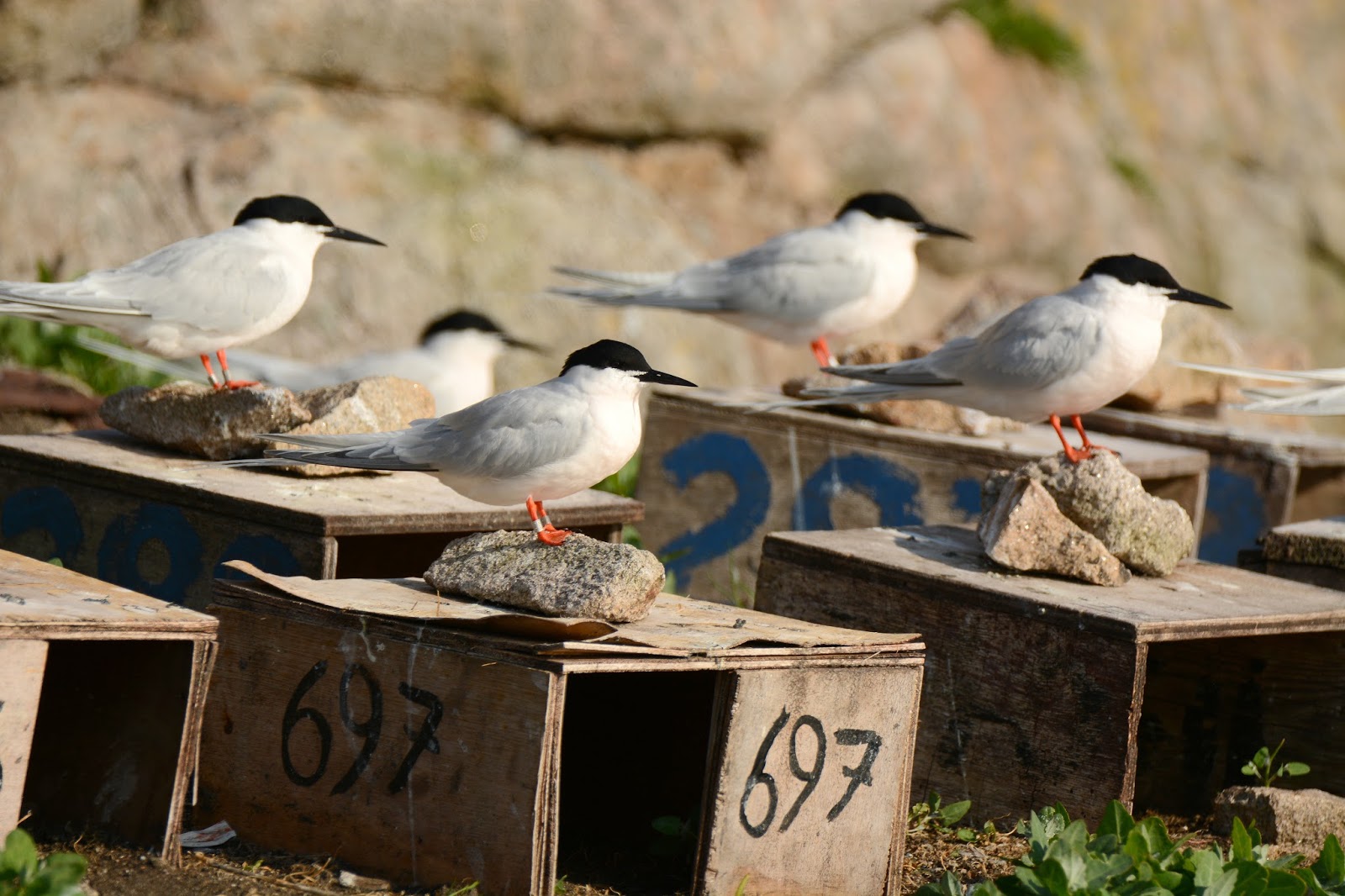 Roseate Terns on their nestboxes early in the 2016 breeding season Rockabill. (picture taken under NPWS license) |